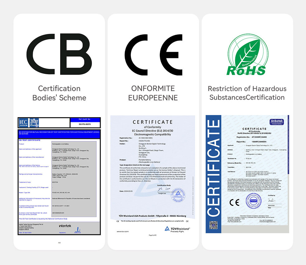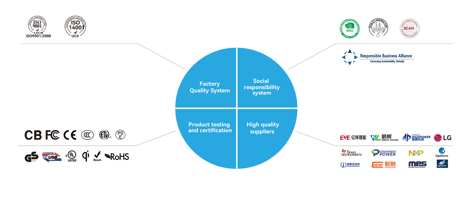 We hold 22 product certifications recognized across most countries worldwide, including CE, CB, RoHS, UL, PSE, UN38.3,FCC,and more.